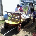 ゴールデンウィーク最終日、。農家で使えなくなった手押し車のタイヤを修理して、ベニヤ板を敷き、子どもたちとがペンキ塗り、小さな手づくり馬車が完成しました。