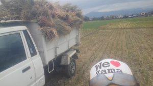 作業は脱穀機で米粒を分離し、そのご牛のエサの藁をトラックに運ぶ作業!