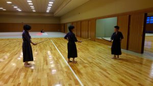(写真:間合いをとり気声を発せず、人と接近しない稽古の様子)