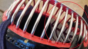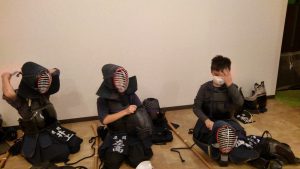 (写真、コロナ禍のなか、マスクと面中にマウスシードを装着し稽古に向かう子供)