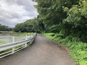 「栗原遊水地」遊歩道周辺の森林の枝が、雨が降ると垂れ下がり