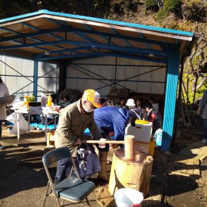 昔ながらの臼(うす)と杵(きね)を用いて餅をつくりました。