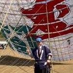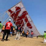 「新風」と画かれた大凧が、ドラえもんプルーの青空に舞い上がりました。