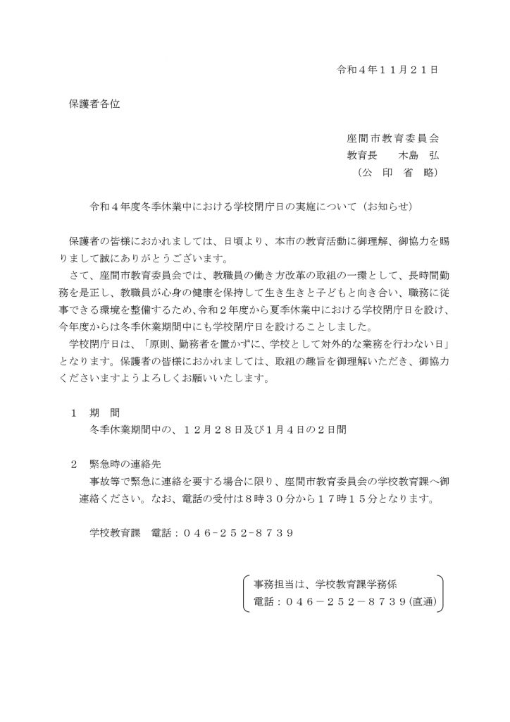 今年度から、冬季休業期間中に「学校閉庁日」を授けることにしました。