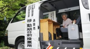期日前投票にて大学生を8名雇用して若者に参加をしてもらう取り組みを行っています。また若者世代の投票率の減少に関しては、住民票を市外へ移すことが減少の要因との研究結果の報告があり座間市同様同じ問題を抱えている中、かなりモチベーションが高い職員さんには感銘を受けました。この選挙管理委員会の職員のアイデアで生まれたとてもユニークな取り組みが、ワンボックス自動車を活用しての「期日前投票」であります。この取り組みは、H28年の4月の公選法改正で措置を講ずるという条項が加えられたいタイミングで開始されたもので、現在、浜田市南部の9カ所に自動車を活用した移動投票所を設置しています。ここれは、高齢化した有権者および山林で交通手段のない皆さんへの投票を呼びかけようと、浜田市選挙管理委員会が考案したもので、10人乗りのハイエースワゴン車をが投票所にしています。設置にあたり外に受付の机(受付) 雨の日はブルーシートでぬれないよう費用をかけず工夫をし、R3年から高齢者のために踏み台や手すりを造るなど、毎回反省点を改善し着実に事業を推進しています。その結果、都市部は投票率が低くなる一方、移動投票所を行う、山岳部では投票率は良いという効果が合われています。この移動投票車の取り組みの成果としては、投票率低下防止の一助となる事は目に見えていますが、今後の課題として、悪天候時の計画対策、本部管理体制、そして、事務従事者の確保を挙げられていました。