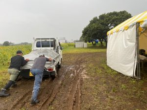 AM8時 泥濘から軽自動車を押す