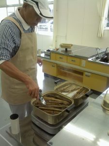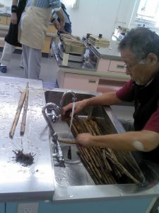 (写真 ひまわり茎加工作業)