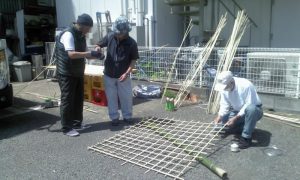 (写真 座間の伝統「箱結び」で凧の骨組みをする、あすなろ大学の研究生)