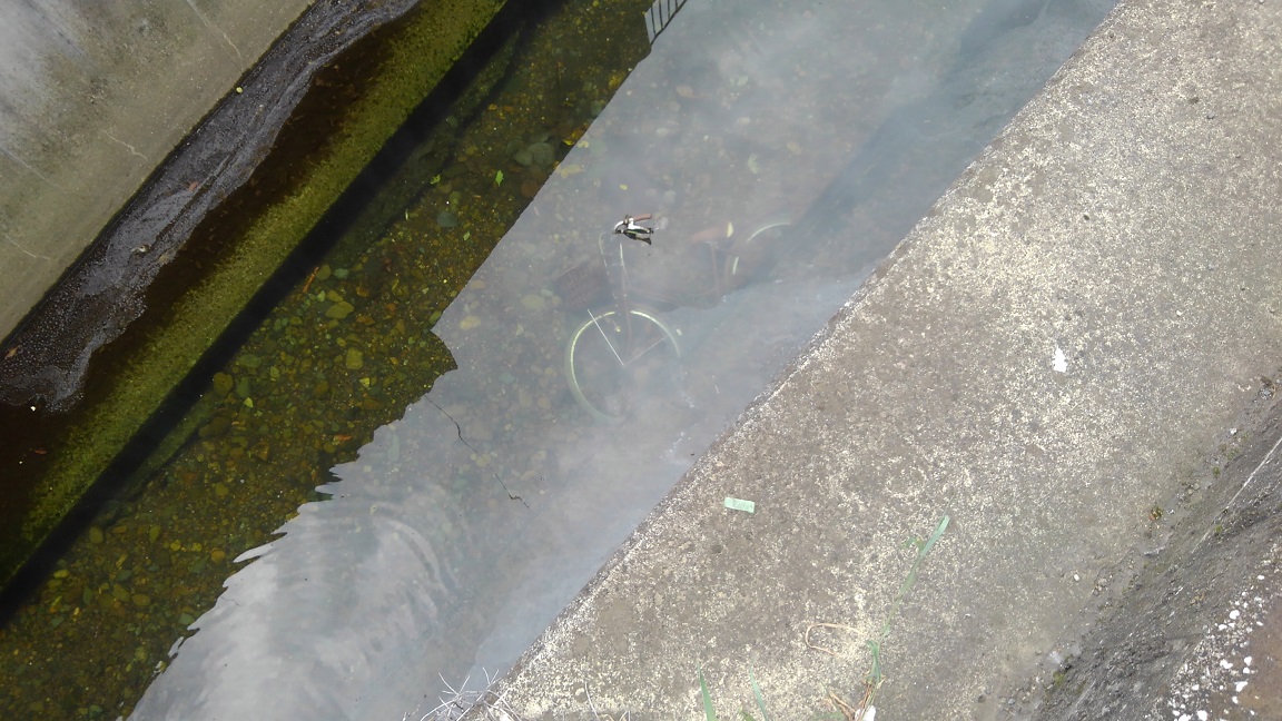目久尻川に沈む自転車