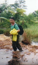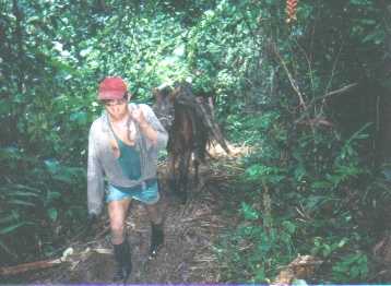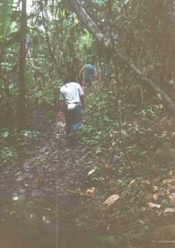 早朝、最新鋭のアルミの舟をレンタルし、ガイド、エドウィンを含む僕達連合軍4人は、イキトスから舟を走らせること1時間30分、ようやく陸地にたどり着く。舟を降りるとわれわれは薄くらい茂みのジャングルへとすい込まれていく。このような日中でも暗い密林、自衛隊で訓練を受け方位磁石を持参しての前進でも一歩間違えれば密林の森から逃げ出せない状況だった。今考えると恐ろしい経験だ!!!