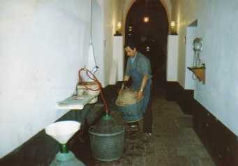中世、トスカーナ地方の繁栄をもたらした名家メディチ家の御用達ワイナリーだった今も健在のカンティーナ(ワイン蔵)コントゥーチ家の熟成されたばかりのワインを菰瓶に詰める職人。(モンテプルチアーノ村)
