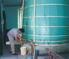 蒸して柔らかくなったアガベの株は破砕機で潰され左写真の共同銭湯のような石造りの発酵桶に流し込まれる。発酵桶に流し込まれたアガベの汁に温水と酵母を加えて約4日間アルコール発酵させた後、蒸留作業に入る。