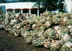 テキーラの原料になるアガベ(竜舌蘭)大きいものは直径1メートル以上のものもある。竜舌蘭はわが国、日本では九州、四国、伊豆、房総あたりの黒潮の洗う海岸あたりでよく見受けられる。竜舌蘭は肉の厚い1メートル以上に伸びる葉で、葉の縁にトゲがある。この芯の新芽のところを繰り抜いておくと汁がたまるこれを集めて酒にするのが昔のやり方。これから簡単にテキーラの造り方を紹介しよう。