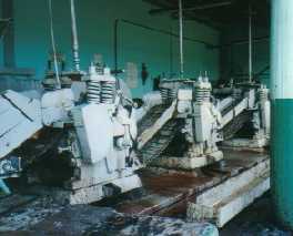 アガベの株を高圧蒸気窯で蒸した後は、左の戦車のキャタピラのような機械でアガベを破砕、糖分を含んだ甘い汁を絞り出す。