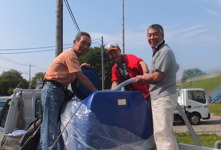 大型ポンプから汲み上げられ、塩素を加えて水道水になる前の『新鮮な水』を酒屋の配達車に乗せられたポリ水槽に汲み込む『じゅんろう』と2人のチョイ悪おやじ。(左:酒販組合副理事 右:座間市酒販組合会長)