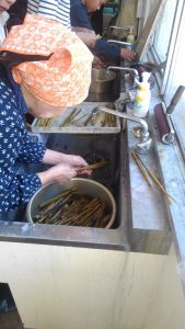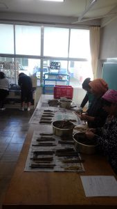 (写真 ひまわり煮込み作業、茎洗い、選別、繊維加工作業)