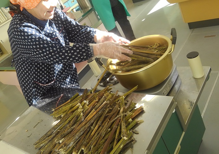 ひまわり茎煮込み作業