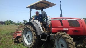 (写真 青空の下子供たちのヒマワリ畑をトラクターで開拓しました!)