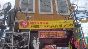 (写真)強風で紐がきれてしまった横断幕を修正するじゅんろう
