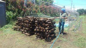 (写真 青空の下原木に水をかけ、シイタケ生産の準備をする座間の農家(栗原小池地区))