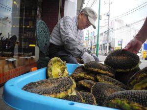 ガリガリ君という器具でひまわりを擦り、脱粒をします!