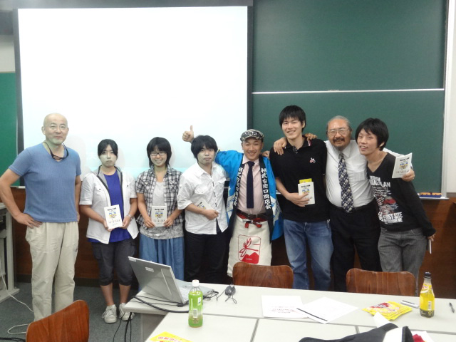 横浜市鶴見にある『横浜商科大学』にて15回にわたり行われていた商業者を育てる目的の授業『商店街の実際』が終了しました。大学生のみんな、とにかく与えられた環境を楽しもう!! 横浜商科大学の学生たちと坪倉先生(写真左)佐々教授(写真右2番目) じゅんろう(中央)