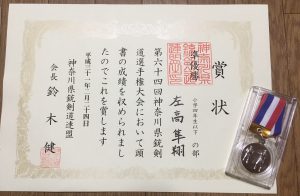 (写真 元陸上自衛隊通信学校長 鈴木健会長からの表彰状とメダル。隼翔くん日頃の稽古風景(スカイアリーナ座間))