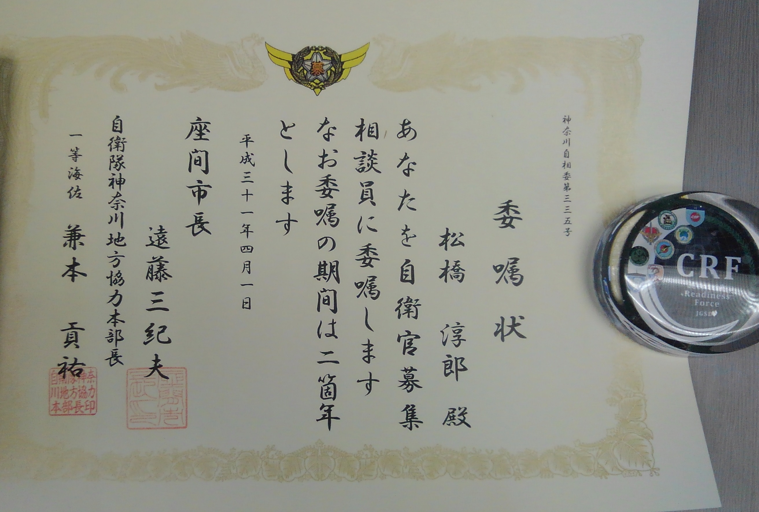 自衛官募集相談員委嘱状