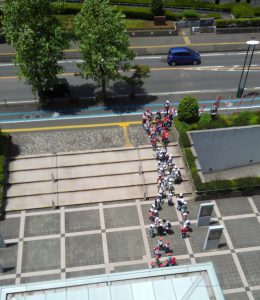 (写真 庁舎見学を終え学校へ戻る小学生たち。座間市役所6階事務室から)