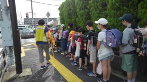 (写真 68日ぶりの全員登校 こども達を見守る校長先生と交通指導員の方々)