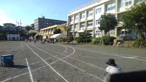 (写真 晴天の青空の下運動会の準備 地元市内小学校)