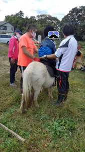 (写真 しつけられたポニーでリハビリテーションを行う松平氏(右長靴男性))