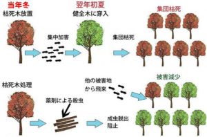 保水力が高いナラ系樹木の枯死により最悪の場合は土砂災害が起こることも心配されます。