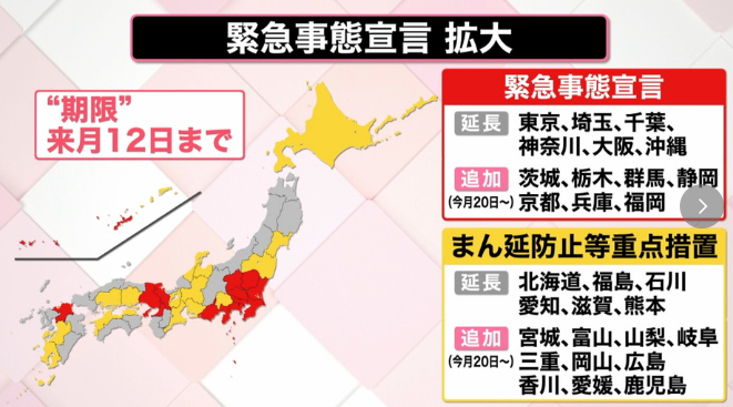 緊急事態宣言地域拡大と延長(来月8月12日まで)
