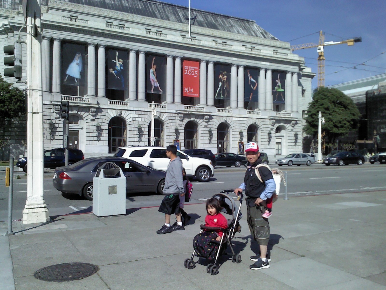 オペラハウス外観と長女(ベビーカー)次女(背中1歳)
