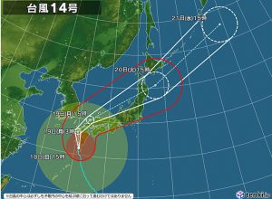 大型で非常に強い台風第14号は、18日15時現在、指宿市の南約60kmにあって、