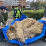 藁(わら)を敷き詰めるための作業を