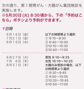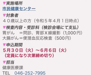本日より座間市第一期「胃がん・大腸がん集団検診」