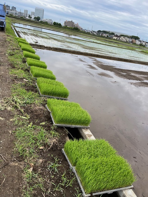 植え付け苗 畑の向こうは海老名市