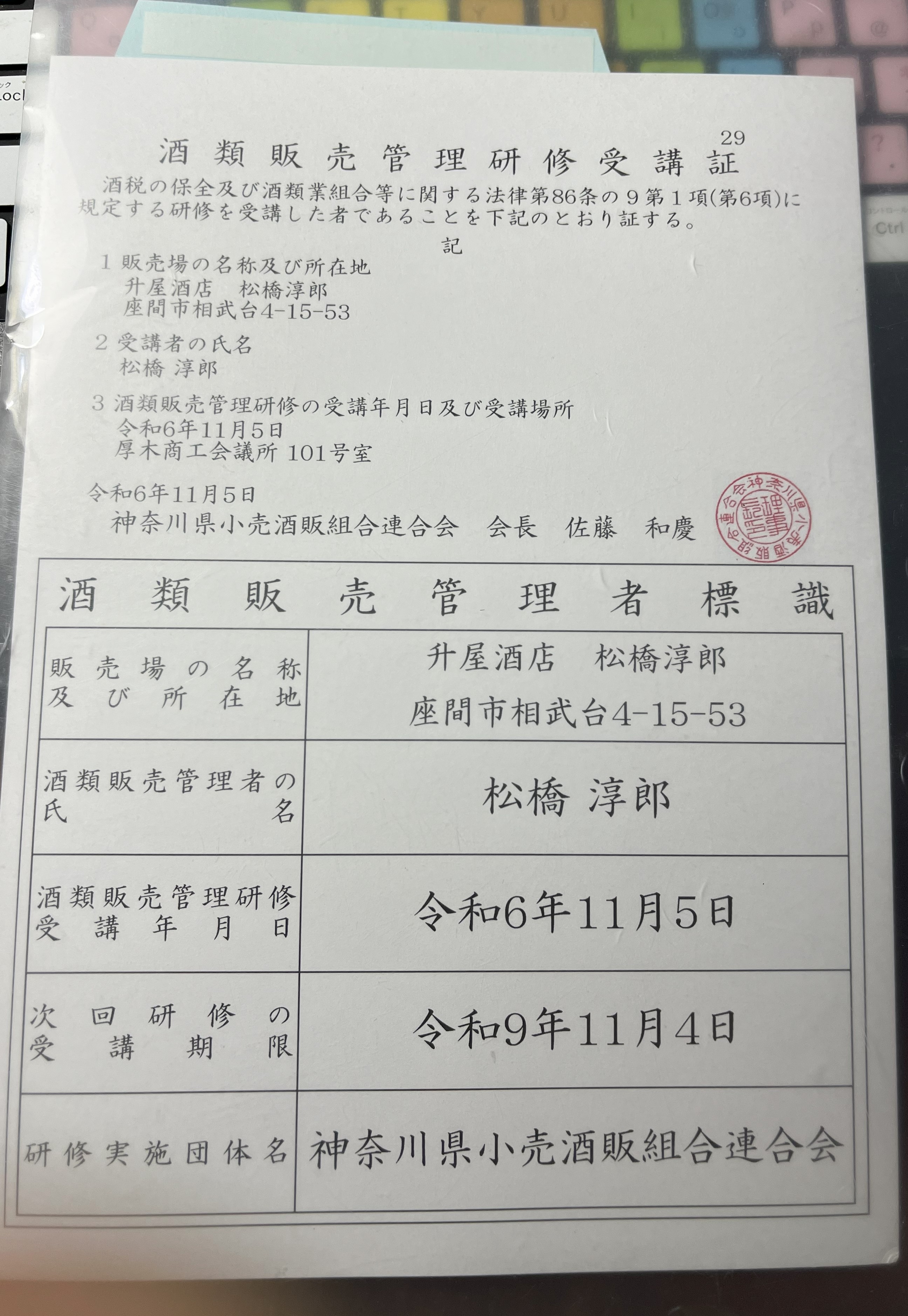 酒類販売管理研修受講証明