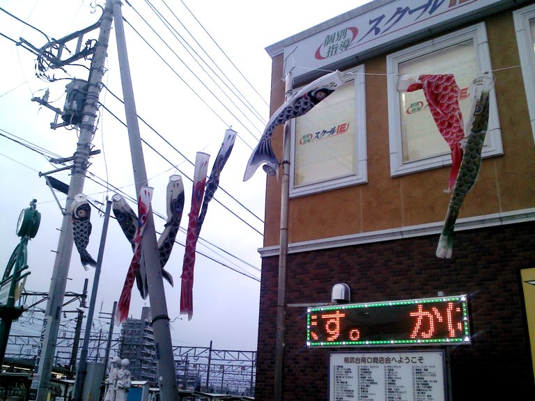 5月1日 座間市相武台前駅 近年「コイノボリ」を飾りたくても飾れない世の中、地元の高校生ボランティアと、近隣の皆様のタンスや押入れに眠っていた「コイノボリ」を頂き、駅前に飾りました!!。 座間市内の商店会では、さがみ野駅北口、相武台前南口が子供たちの成長を祈り「こいのぼり」を掲上しています。 商店会の皆さん、コイノボリを掲上しましょう! 日本の伝統と未来の子供たちのために!!
