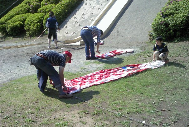 5月6日(月) (座間市かにが沢公園) ゴールデンウィーク最終日、 地元の公園に掲げれらた27匹の大きな「鯉のぼり」を地元のボランティアや こどもたちと撤収いたしました。また来年大空を泳ぐために背の順に整頓され箱に入れて眠りにつきました。