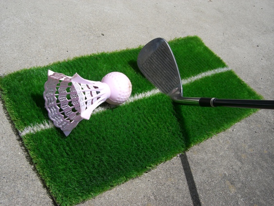 (写真:ターゲットバードゴルフ (target bird golf) は、ゴルフボールにバドミントンの羽をつけたボールをゴルフクラブで打ち、打数の少なさを競うスポーツである。)