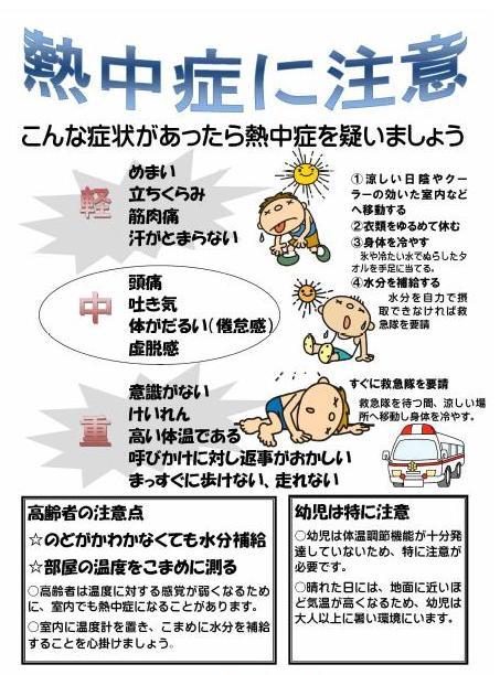 無理な運動を控え、小まめな水分補給や適切な冷房の使用で熱中症に注意するよう呼び掛けています。