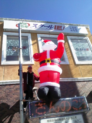 11月19日(火) 今日は、相武台前駅前に2m80cmのジャンボサンタクロースを飾りました。 設置場所は、南口ベンチ前。歩道拡張に伴い、設置場所ベンチ切断を来月12月に行うため、 今年はイルミネーションが少なくなっております。ご理解のほど宜しくお願い致します。