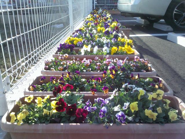11月24日(土) 今日は、座間市役所から年二回配布されますプランターを歩道に並べました。 役所道路課から配布されるプランターは、駅周辺の希望をする商店会、商工会の会員さまに配布されています。 プランターの運搬は、農家のボランティアの方々が運んでいただいております。 この素朴な取り組みは、10年近く続いております。 (写真 綺麗に並ぶパンジーのプランター)