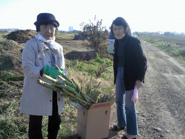 (写真 冬のヒマワリの茎を収穫する座間市あすなろ大学の学生)