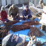 (写真 左・中央・和紙の原料コウゾはぎとり作業 右・紙漉き作業を伝授する館長)