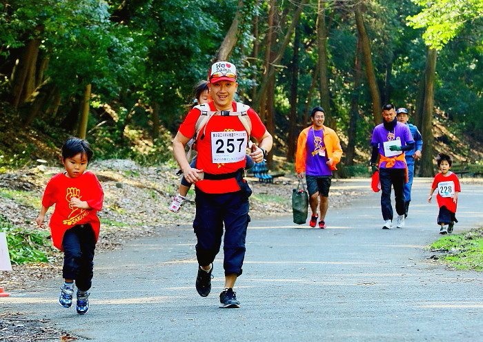 (子供のための「わんぱくコース」を子供を背負い走るじゅんろう)