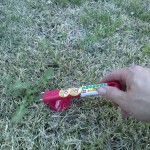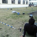 (写真 約200坪の芝生研究場所とカイト君・くぎ抜きの原理で雑草を抜く優れものの小道具)